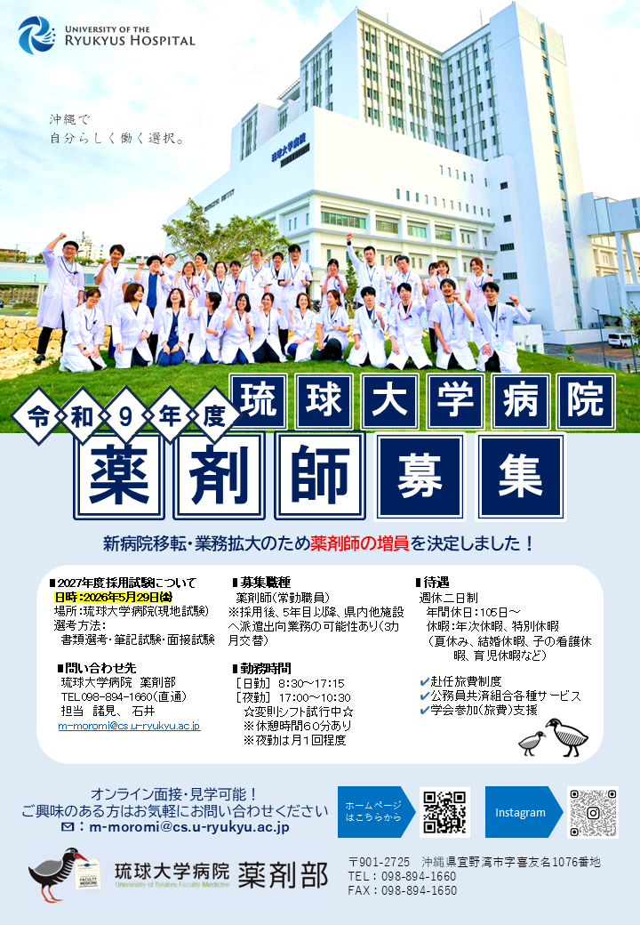 採用ページはこちら をご確認ください。 採用情報につきましては、下記までお問い合わせください。 琉球大学病院 薬剤部 TEL 098-894-1660(新病院薬務室) 担当 諸見、 石井、 原 メール:m-moromi@med.u-ryukyu.ac.jp